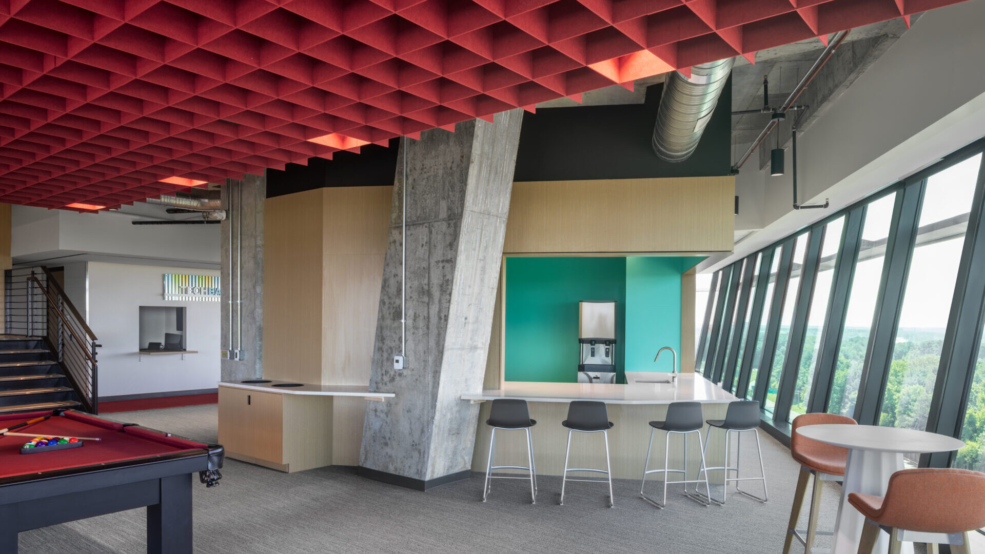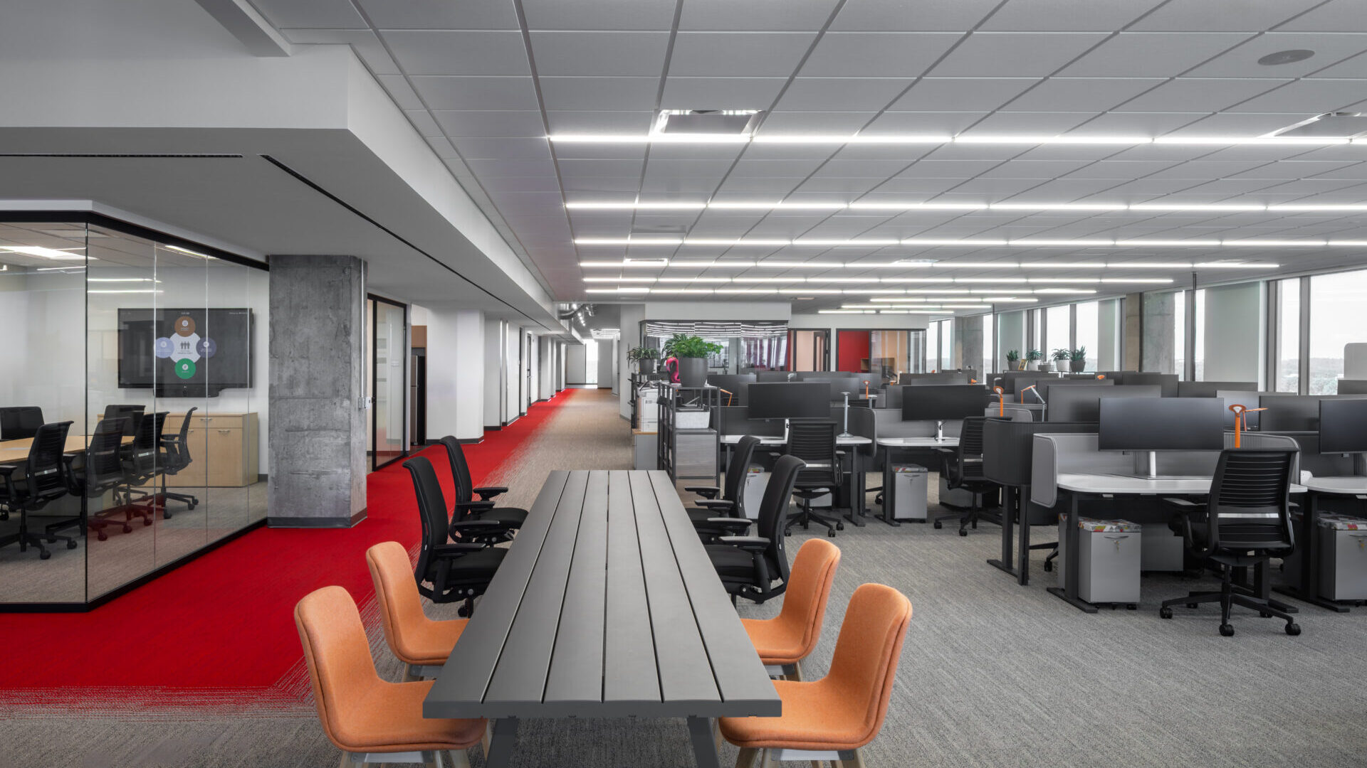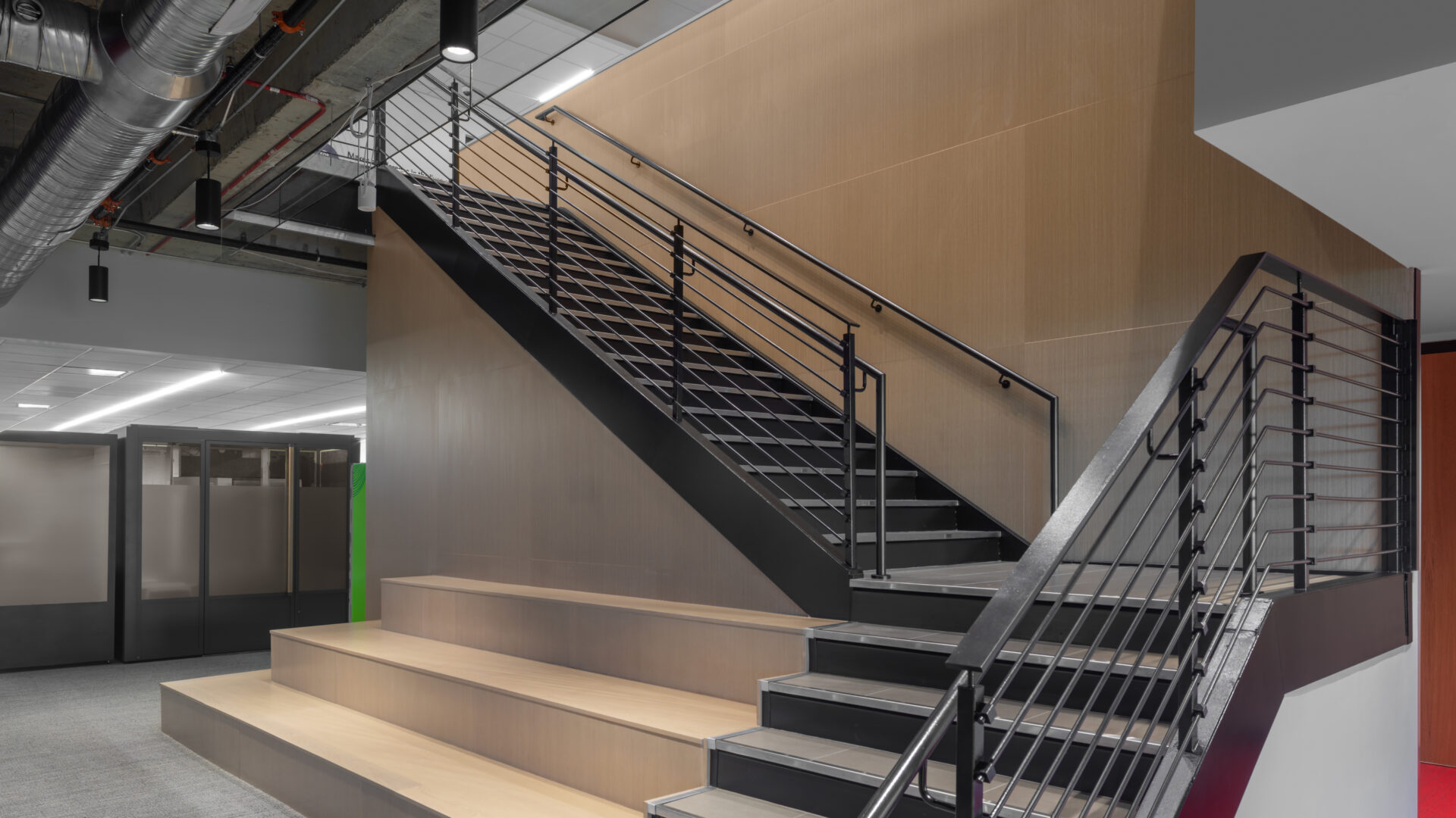 Occupying the 7th and 8th floors of One North Hills Building, CHG’s new office is a high-performance environment tailored for connection. Designed to support a modern, collaborative workforce, the space features expansive open work areas, private offices, and versatile meeting rooms. A flexible training and gathering space ensures teams have room to grow, learn, and lead. At the heart of the design is a monumental interconnecting stair—a bold architectural centerpiece that links the two floors. Constructed within a live, occupied building, this feature required meticulous coordination to preserve both structural integrity and design vision.