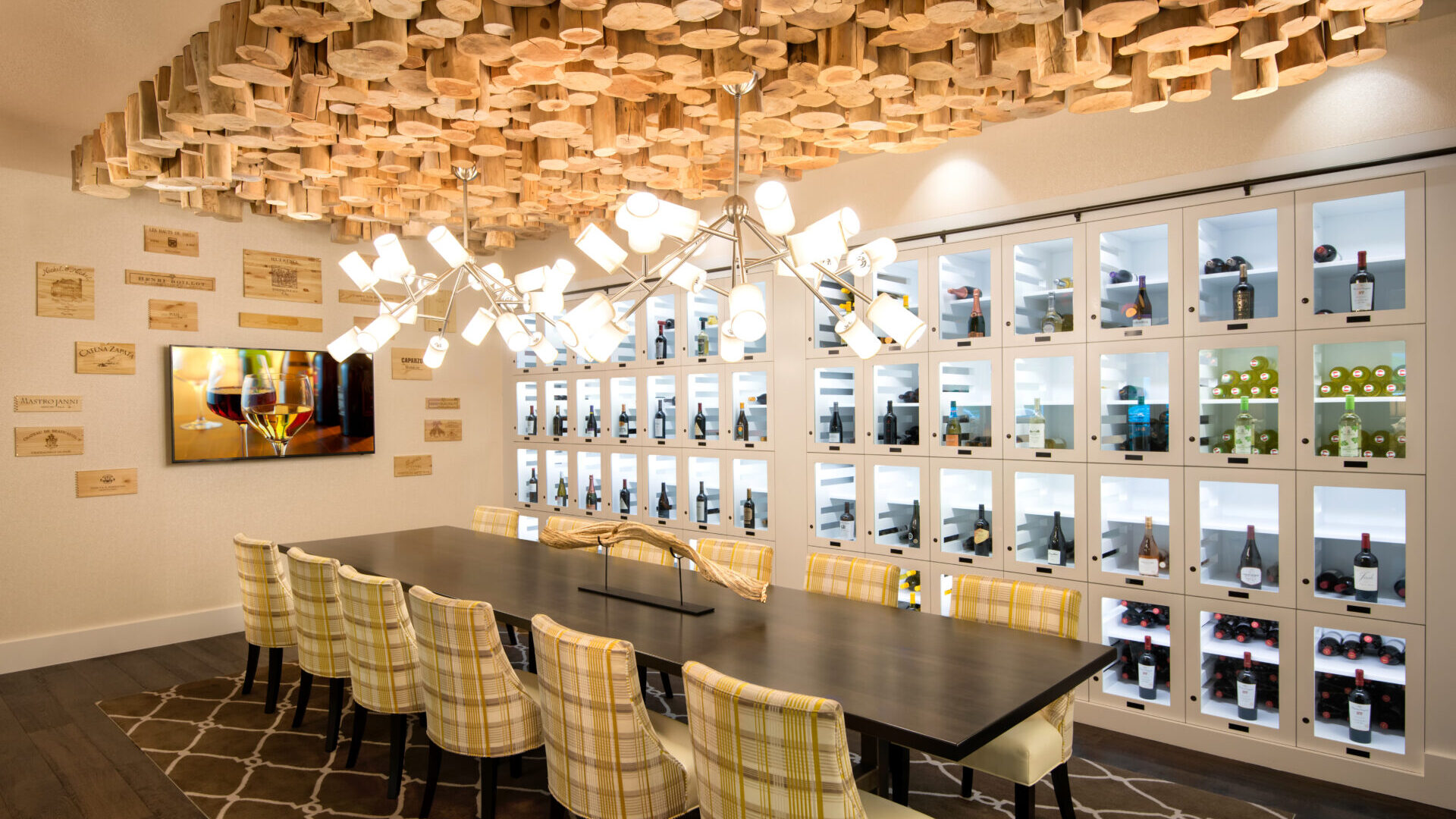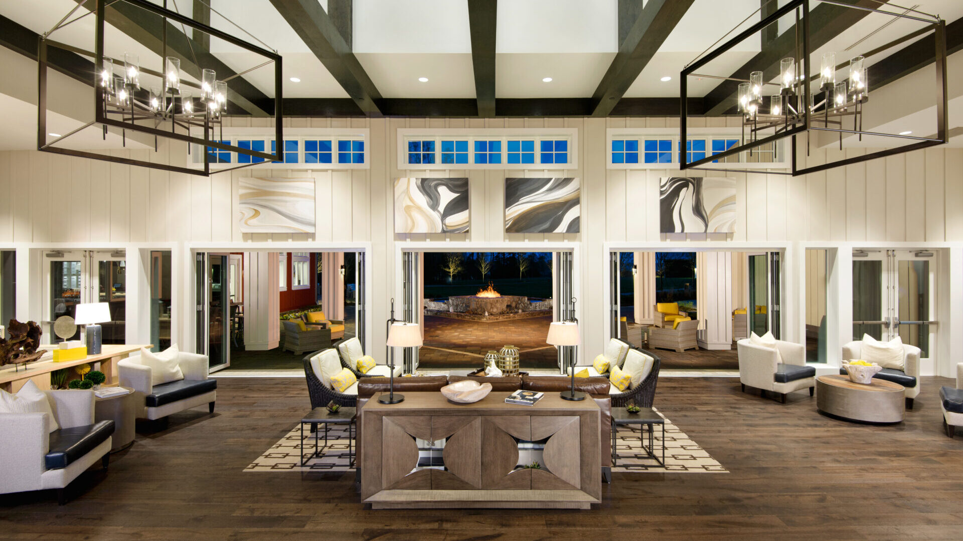 This stunning clubhouse features intricate stone and tile details, rich wooden floors, and distinctive chandeliers, creating an inviting atmosphere. The chic interior seamlessly blends modern living with relaxed lakefront charm. Exposed ceiling beams complement the custom stone fireplace as a striking focal point that creates warmth and character for the space.
